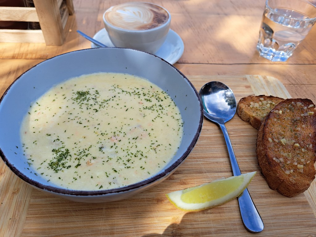Moana has two restaurants. Both of them were not open until 10 am. I chose the restaurant closer to the lake and ordered a latte and a bowl of chowder. The hot soup was heartwarming, and so were the blue sky and white clouds. The weather forecast continued to be good the next day, so we decided to go further west and booked a cottage for one night in Charleston. The price is slightly more expensive than Twizel’s, but the cottage has a million-dollar sea view, and there is an outdoor bathtub next to the house. Absolutely great value!