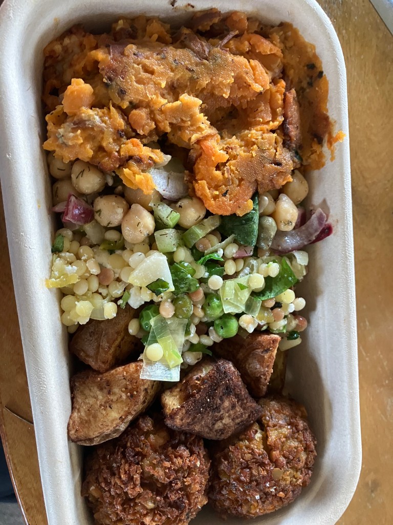 We ended up in a cool shop where they sell coffee and healthy food. I also got takeout from the shop for my dinner – pumpkins, peas, and falafel.